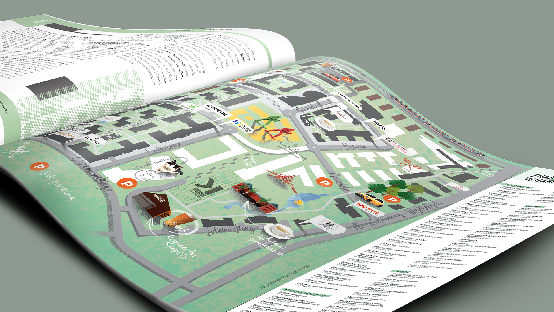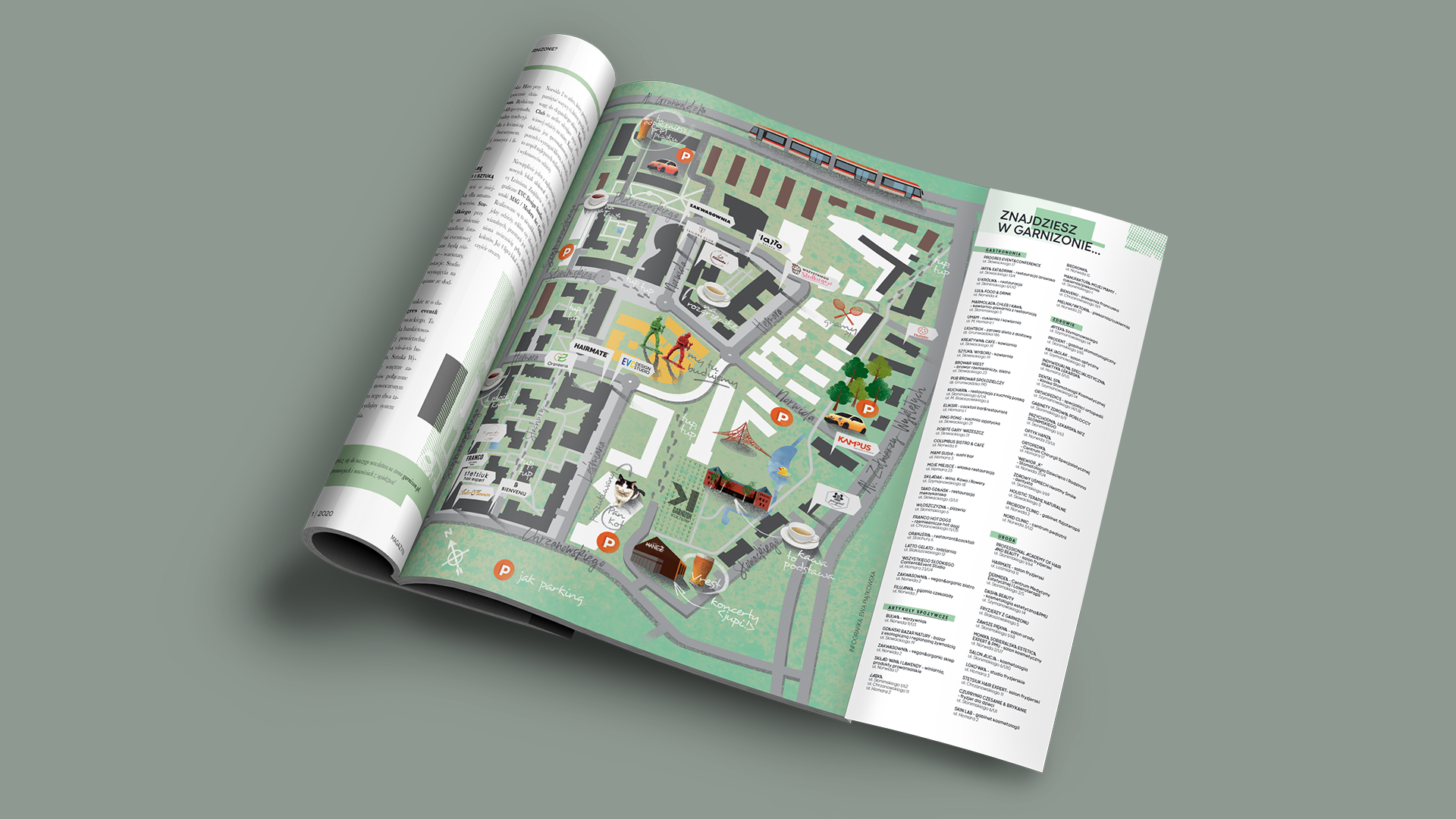 Nasze biuro projektowe znajduje się na terenie osiedla i od kilku lat jesteśmy członkiem tej społeczności. Dlatego zdecydowaliśmy się na “subiektywny” i humorystyczny projekt mapy Garnizonu.
