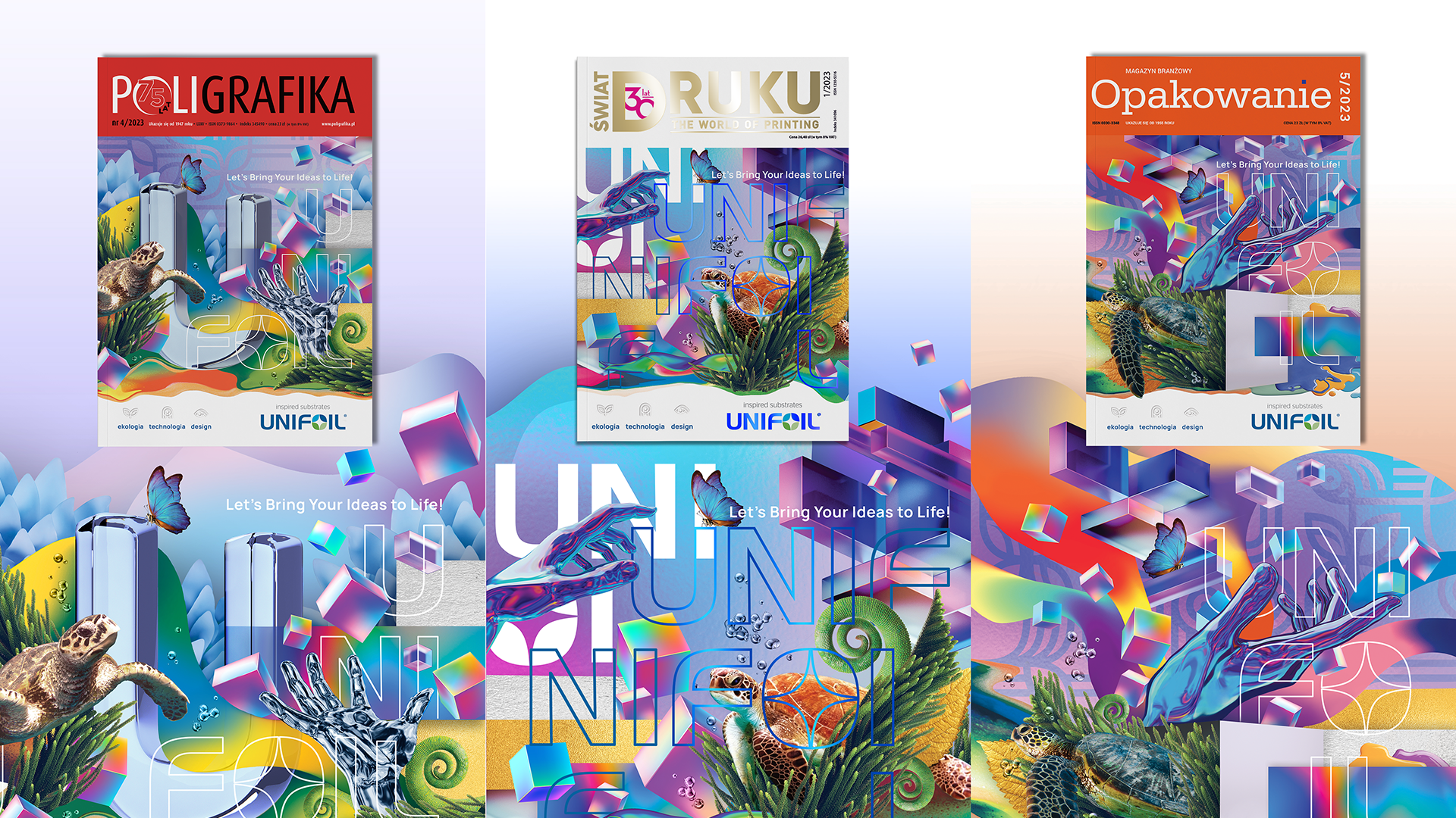 Efekt? Komplet trzech spójnych i zapadających w pamięć kreacji graficznych. Wydanie ‘Świata Druku’ zostało dodatkowo uszlachetnione złotym i niebieskim metalizowanym hot stampingiem